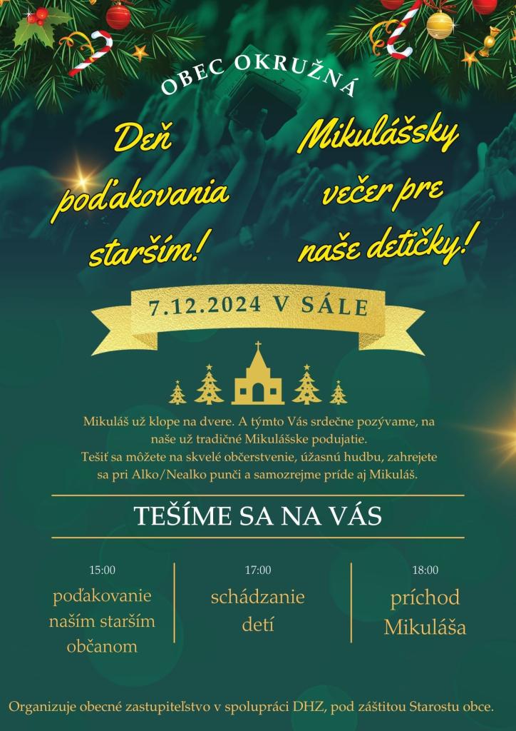 Podujatie sa uskutoční 7.12.2024 v sále Obecného úradu. Program zahŕňa poďakovanie starším občanom o 15:00, schádzanie detí o 17:00 a príchod Mikuláša o 18:00. Na návštevníkov čaká skvelé občerstvenie, úžasná hudba a punč. Organizuje obecné zastupiteľstvo v spolupráci s DHZ a pod záštitou starostu obce.