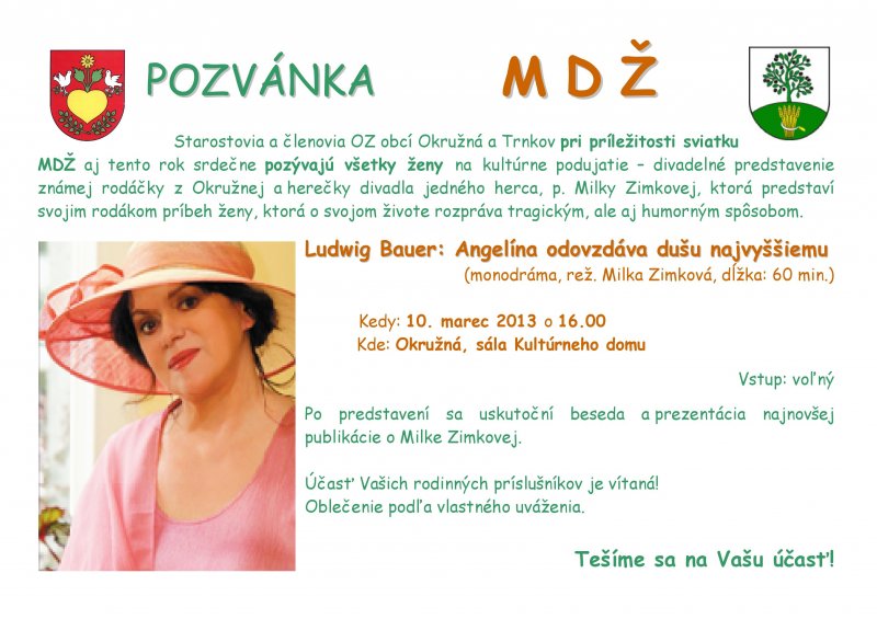 Tentokrát svoje divadelné umenie predstavila naša slávna rodáčka Milka Zimková, ktorá prezentovala monodrámu s názvom Angelína odovzdáva dušu Najvyššiemu... Takmer hodinová hra bola príbehom ženy, ktorá o svojom živote rozpráva tragickým, ale aj humorným spôsobom.